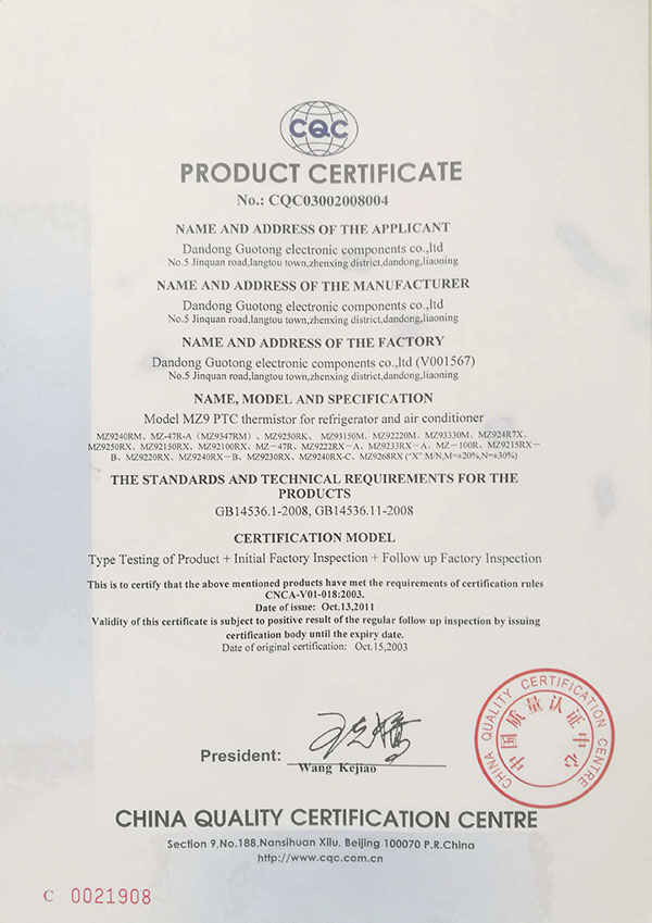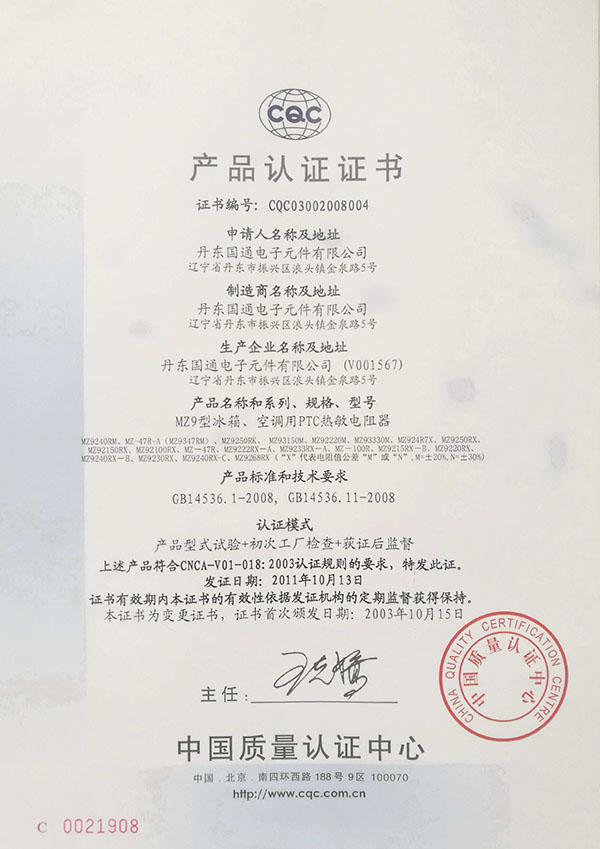 CQC自愿性产品认证-PTC热敏电阻MZ9型-CQC03002008004