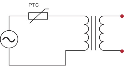 当变压器为输出一路电压时,一般在变压器输入电路中串联在初级线圈中PTC热敏电阻,见下图。