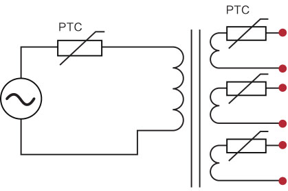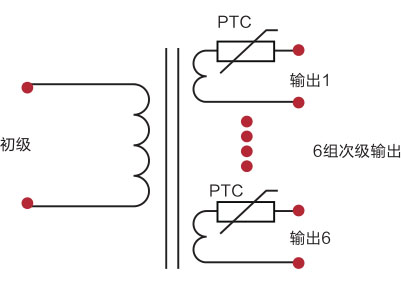 3、当变压器为多路电压输出时,且功率较大,初级线圈中已无法安装PTC热敏电阻实施保护功能,这种情况下,只能在输出端每路输出电路中串接PTC热敏电阻,保证各路各自正常工作和动作保护。见下图。