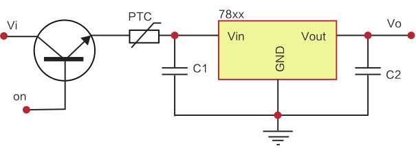 4、当PTC热敏电阻器直接串接在过流电路中,一般低电压电路大多保护稳压块和三极管。见下图。