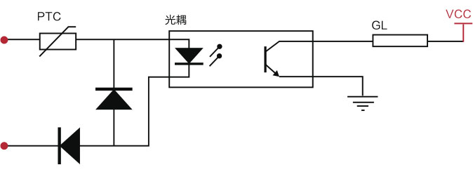 5、当PTC热敏电阻器串接在通讯电路中,通过过电流保护功能和自身的耐电压能力保证故障时电路中光偶不被烧坏,见下图。